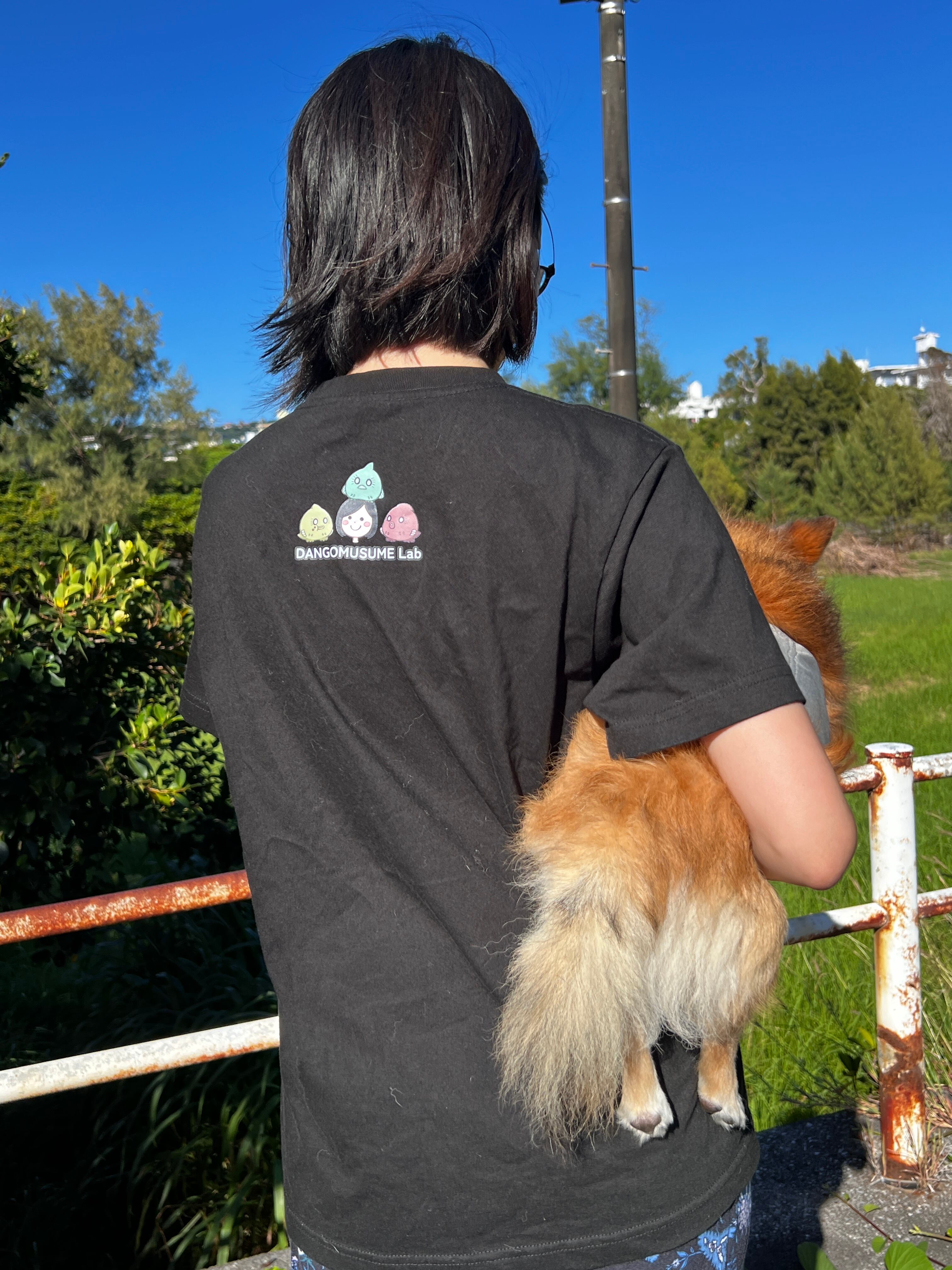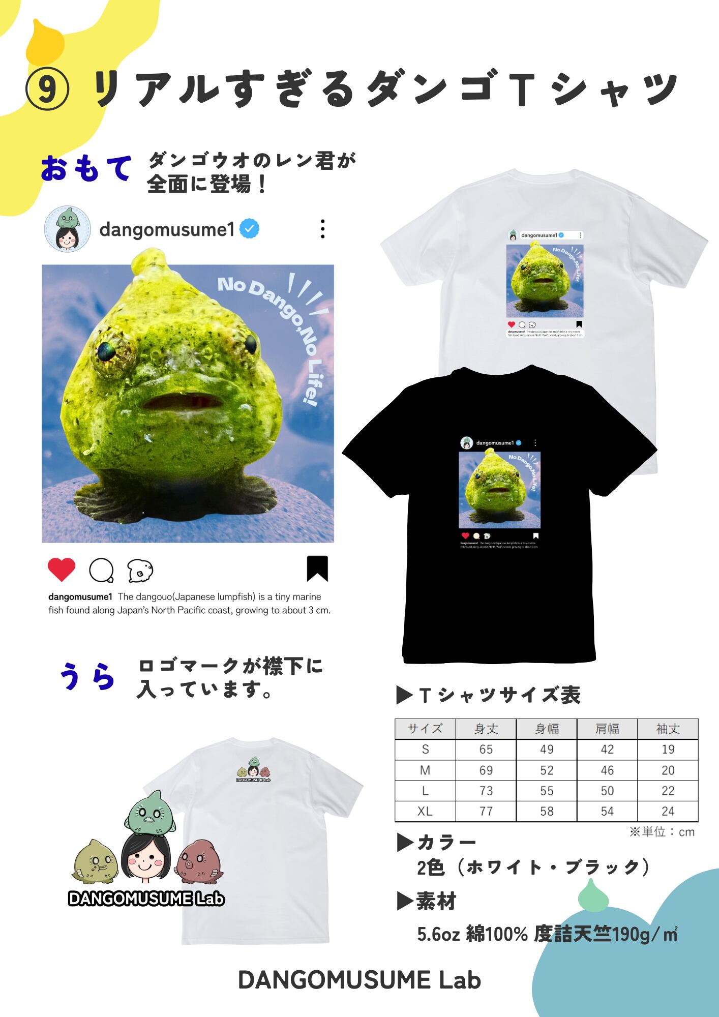 色鮮やかなダンゴウオが飛び出たSNS風デザインのTシャツで、背中の襟元にはだんごむすめラボのロゴが入っています。