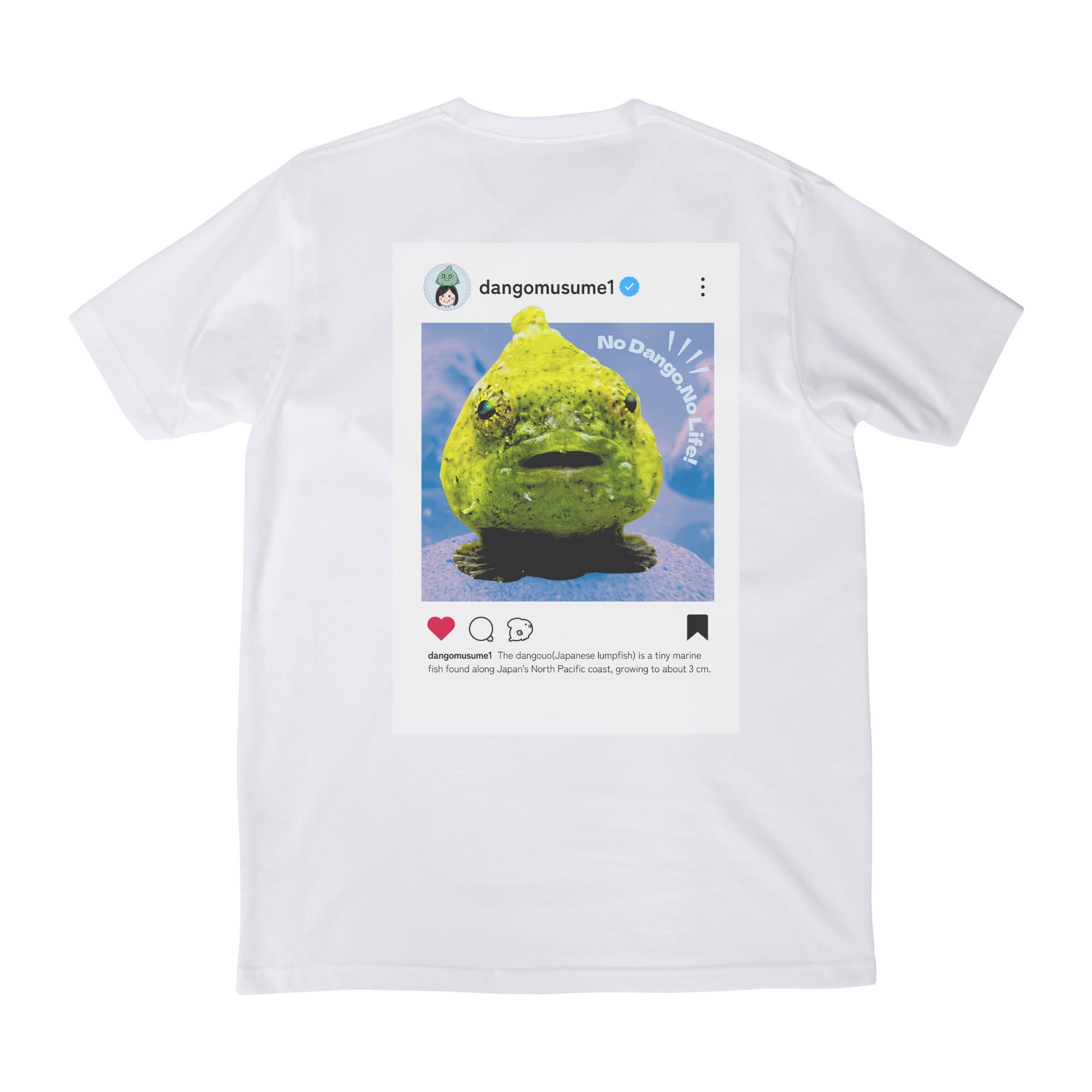 色鮮やかなダンゴウオが飛び出たSNS風デザインのTシャツで、背中の襟元にはだんごむすめラボのロゴが入っています。